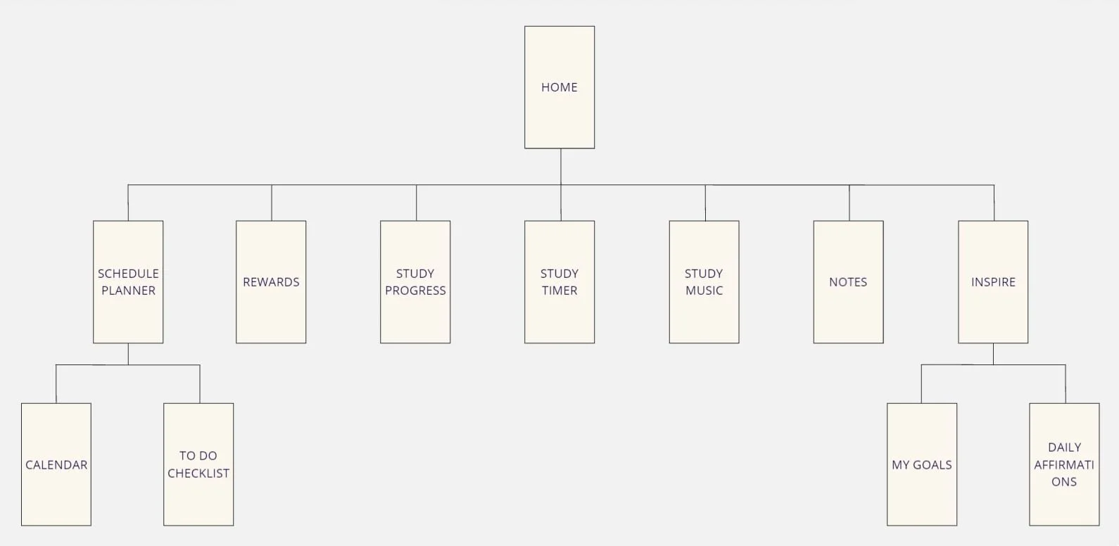 I created an app map to clearly visualize the key features and navigation of the mobile app, which was crucial for ensuring a user-friendly experience. This step effectively guided the development process, showing how students and young professionals can stay organized, motivated, and connected in their studies, ultimately enhancing their learning experience.